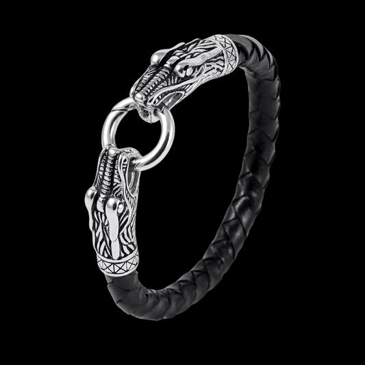Vikingo Jormungand de acero inoxidable con pulsera de cuero trenzado