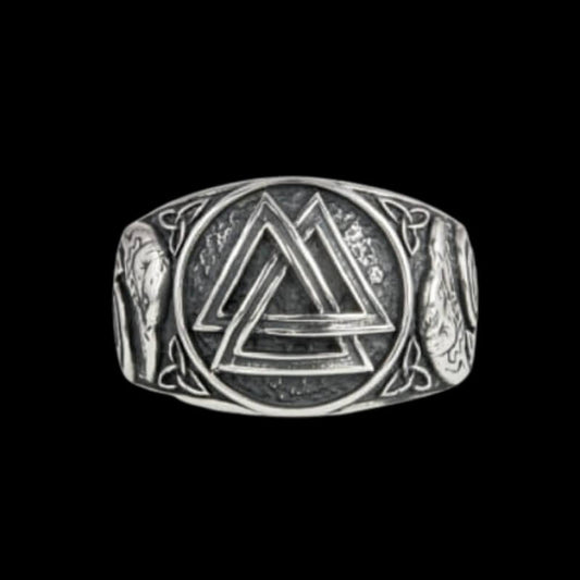 Anillo de plata de ley con lado de cuervos antiguos de Valknut hecho a mano
