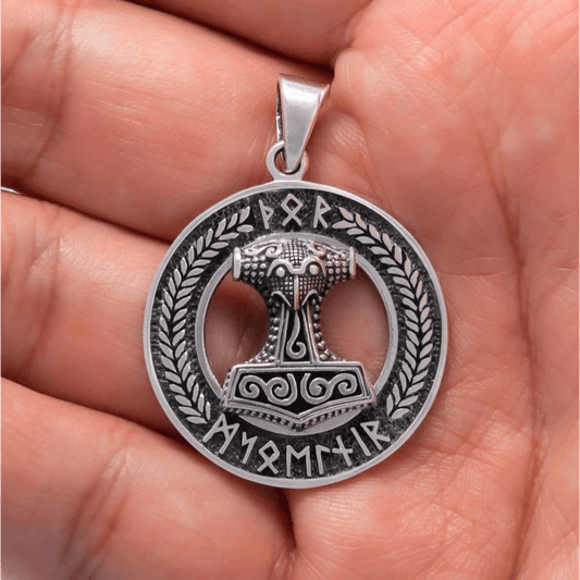 Mjölnir con colgante de plata de ley con escritura de runas nórdicas