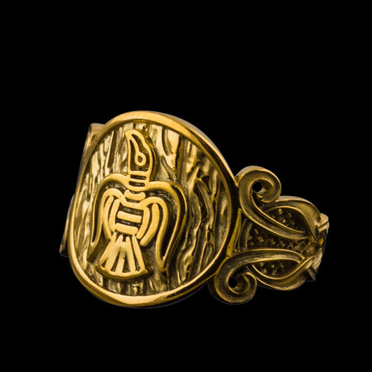 Anillo de oro estilo urnes con símbolo de cuervo de Odín hecho a mano