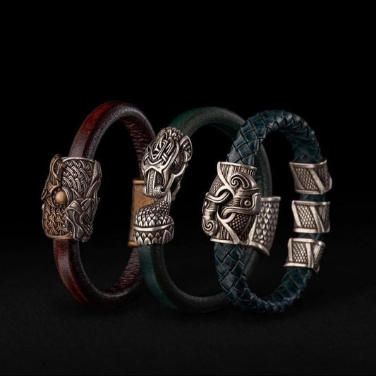 Para nuestras pulseras con dijes de cuero grueso, elija entre una correa de cuero negro o marrón y luego placas de bronce o solver con símbolos importantes del mundo vikingo. Elija una pieza que nuestro equipo haya seleccionado o elija sus propias piezas para crear su propia pulsera significativa.