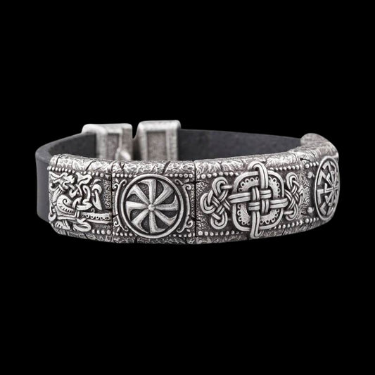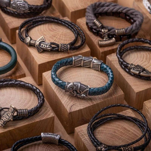Esta es nuestra colección de pulseras envolventes de cuero y pulseras con “dijes” de cuero grueso para vikingos. Cada uno presenta símbolos del mundo vikingo.