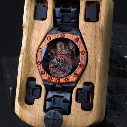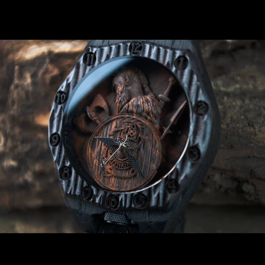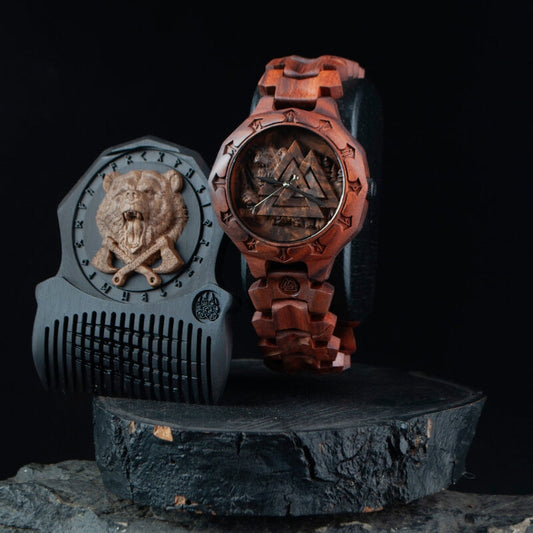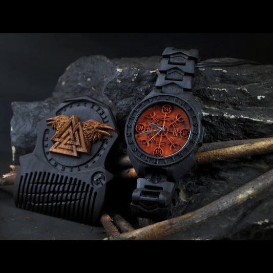 Nuestra colección de vikingos. relojes de madera, con auténticos símbolos vikingos, incluidos Valknut, Odín el Padre de Todo, los cuervos Huginn y Muninn y el Yelmo del Pavor. Cada uno viene en una caja de regalo de madera finamente tallada con un peine de madera de cortesía.