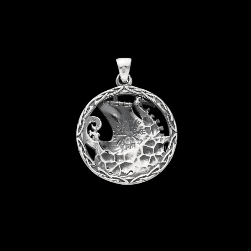 Este colgante de plata esterlina captura la esencia del espíritu del marinero vikingo. A lo largo de sus escudos se encuentran algunos de los símbolos nórdicos más potentes: