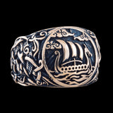 Emprende un viaje de descubrimiento con este Anillo de Sello de Bronce Drakkar Ship, un tributo a los legendarios exploradores vikingos y sus inigualables habilidades de navegación.