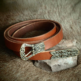 Este cinturón no es sólo un accesorio; es una declaración de fuerza y continuidad, que encarna el legado perdurable de la artesanía vikinga y su conexión tanto con la tierra como con la tradición.