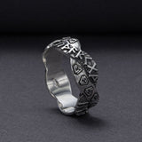 Las runas Elder Futhark ondulan a través de la banda, cada una de ellas un susurro del pasado, contando historias de gloria y la danza eterna del destino. Al deslizar este anillo en su dedo, se conectará con las antiguas energías del cosmos nórdico, un legado que el tiempo no puede erosionar.