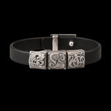 This sturdy leather bracelet is decorated with bronze or silver plates showing themes from Norse mythology. They use a genuine Norse artistic design style. It takes the bodies of animals and twists their limbs to create geometric forms.