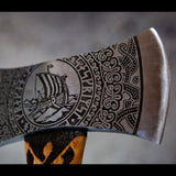 Esta hacha rinde homenaje a aquellos intrépidos marineros que se aventuraron a lo desconocido, enfrentándose a los vastos y peligrosos océanos con una determinación inquebrantable. Sus intrincados patrones y símbolos, inspirados en los ricos tapices de la mitología escandinava, están meticulosamente grabados en el metal, y cada motivo cuenta su propia historia.