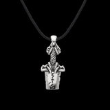 Este colgante de media espada de plata de ley captura la esencia de la espada vikinga, con una hoja rota que habla de las batallas libradas y las victorias ganadas. La empuñadura está adornada con una imagen de Jormungandr, la temible Serpiente de Midgard, que encarna los mayores miedos que enfrentaron los guerreros en sus vidas.