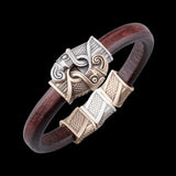La pulsera combina la elegancia del cuero italiano con la mística de las leyendas nórdicas. Su diseño presenta un cierre de gancho, ingeniosamente elaborado con la forma de cabezas de cuervo, que representan a Hugin y Munin. Este elemento único no sólo asegura la pulsera sino que también sirve como un recordatorio constante de la sabiduría de Odín y el poder del pensamiento y la memoria.