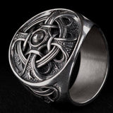 Este anillo de plata esterlina presenta un intrincado diseño de escudo con detalles rúnicos.