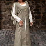Este vestido evoca las historias de sagas donde las mujeres se destacaban orgullosas y nobles, aportando un toque de refinamiento incluso en los tiempos más tumultuosos. Con sus mangas cortadas con puños y su escote cuadrado, el Verena Overdress recuerda los estilos de ropa que podrían haberse visto en los grandes salones vikingos.