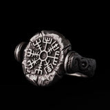 Este anillo presenta dos potentes símbolos rúnicos: Aegishjalmur, conocido como el Yelmo del temor, que se cree otorga fuerza y coraje, y Vegvisir, la brújula nórdica, un símbolo de guía y dirección para los viajeros. Estos símbolos representan una profunda conexión con la tradición vikinga y su creencia en el poder de las runas.