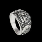 Flanqueado por los venerados cuervos, Huginn y Muninn, símbolos del pensamiento y la memoria, este anillo no sólo encarna los atributos físicos de estas criaturas sino también su significado espiritual. Se creía que la presencia de cuervos en el campo de batalla era una señal del favor de Odín, anunciando el paso del guerrero al Valhalla.